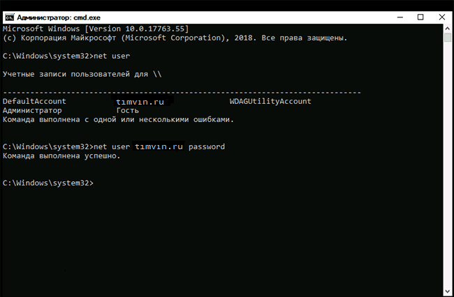 3. Введите команду net user имя_пользователя новый_пароль чтобы задать новый пароль для нужного пользователя. Если имя пользователя содержит пробелы, возьмите его в кавычки. Если нужно удалить пароль, вместо нового пароля введите двое кавычек подряд (без пробела между ними). Настоятельно не рекомендую набирать пароль на кириллице.